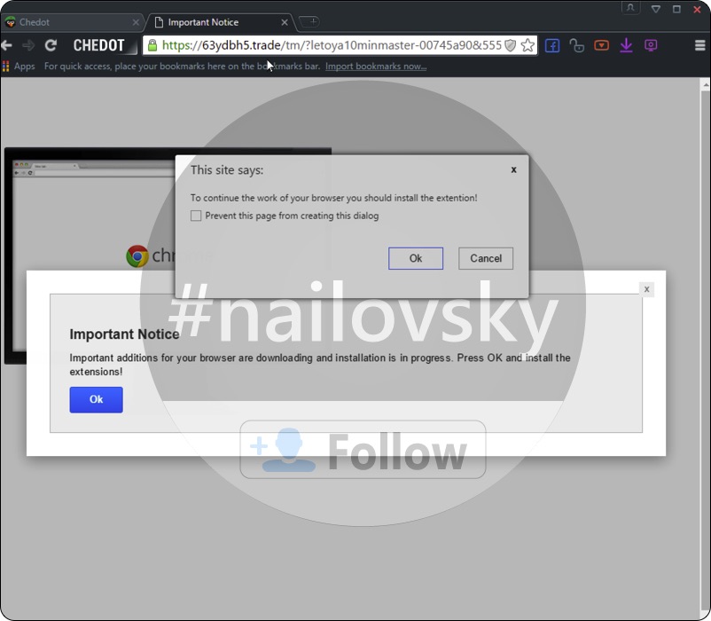 63ydbh5.trade pop-ups have the intention to hijack Google Chrome browser or to infect it with certain adware that functions through enabling certain suspicious extension. The pop-up will tell that you need to install some suspicious extension into your Google Chrome browser. If you actually agree to proceed with such suggestion you may end up facing your browser to be constantly spewing the multitude of annoying advertisement banners, pop-ups and sudden redirection issues.