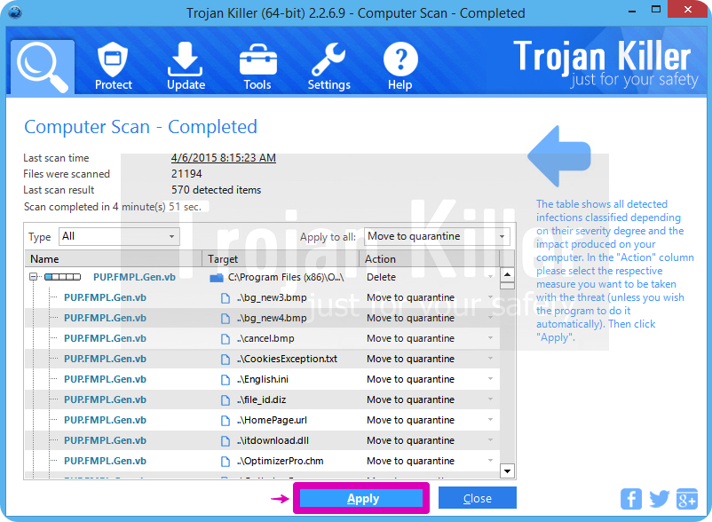 - At the end of scan click “Apply” to remove all infections associated with CinemaPlus-3.3c adware:
