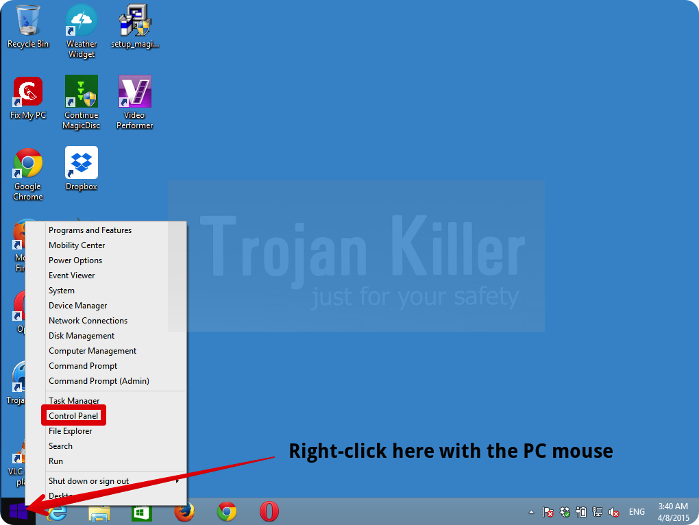 - To access the Control Panel in Windows 8 operating system move the computer mouse towards the left bottom hot corner of Windows 8 screen and right-click on it. In Windows 8.1, simply right-click on the “Start” button. Then click on “Control Panel“: