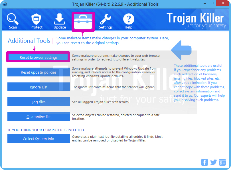 - In Plumbytes Anti-Malware click on “Tools” tab and select “Reset browser settings“: