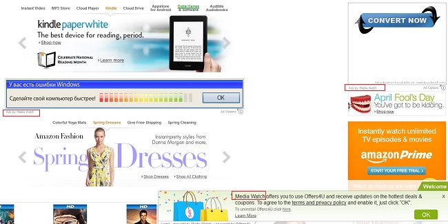 Ads by Media Watch can be displayed in your browser in the form of several advertisement banners of various sizes. Alternatively, they may be presented in the form of pop-ups that come up in front of you when you move your PC mouse towards some words in the text that have double underlining with a green color, being powered by Intext Nav-Links adware display engine. You will see very many of such ads whenever you open any websites, not necessarily the commercial ones. These advertisement banners will be marked as “Ads by Media Watch Ad Options” in their bottom parts. Also, you might see pretty big advertisement banners also related to Ads by Media Watch when you mainly visit commercial websites, such as Amazon, Walmart, Bestbuy and many others. These banners will be marked as “brought by Media Watch” and powered by Offers4U (another adware display platform).