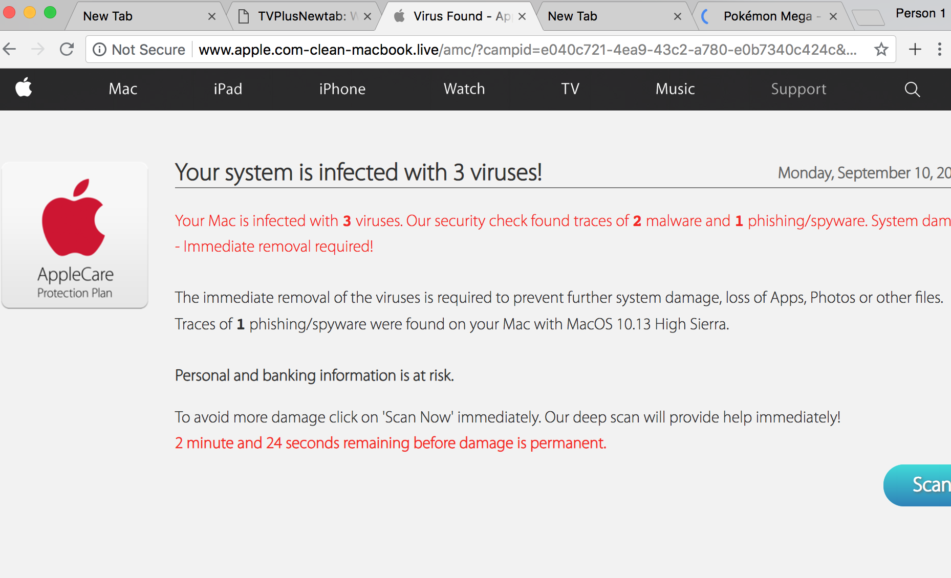 Apple.com-clean-macbook.live pop-ups appear when your Mac is infected with certain adware. The purpose of all adware is to trick you wasting your money, without rendering any decent products or services. Sometimes adware is in charge or producing various intrusive pop-up ads leading to dangerous web sites. In many cases adware uses scary techniques to trick users through fake technical support or custom service pop-up scam. Fake alerts from apple.com-clean-macbook.live web site are the example of such scam.