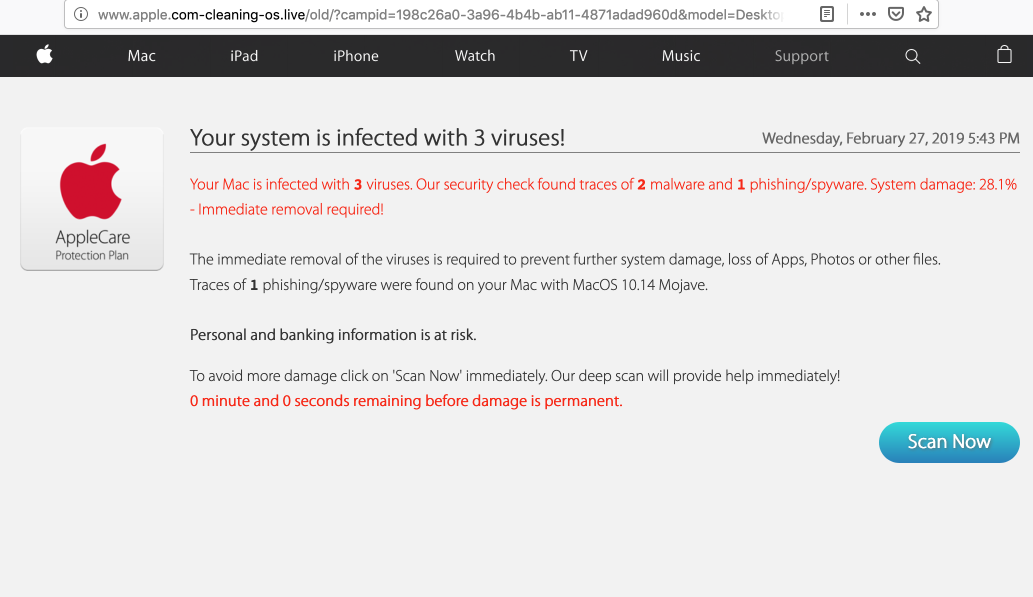Your Mac is infected with 3 viruses. Our security check found traces of 2 malware and 1 phishing/spyware. System damage: 28.1% – Immediate removal required!