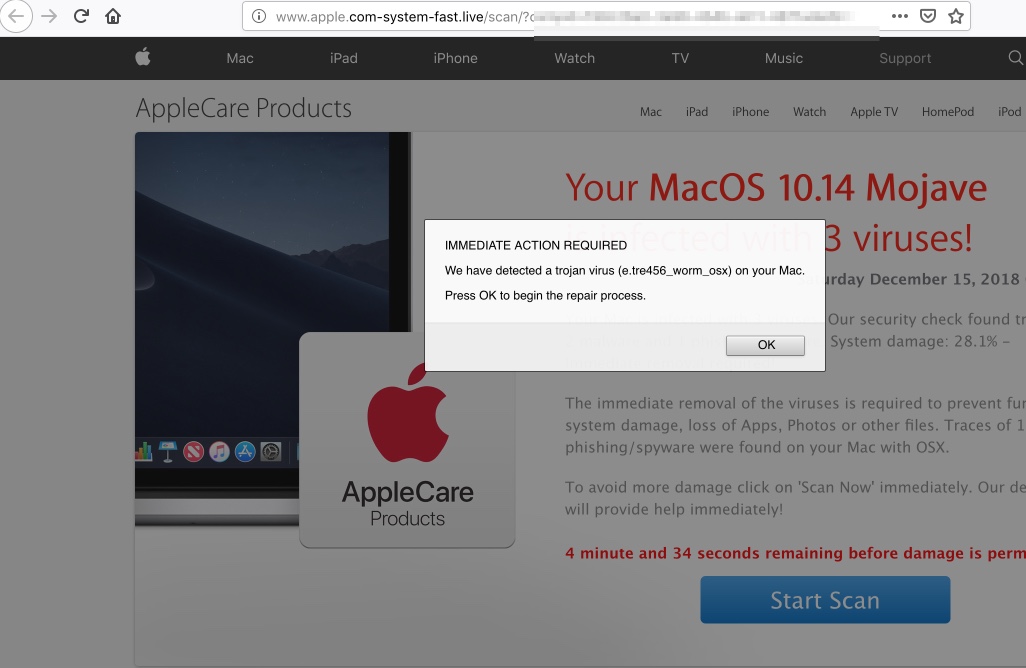 Apple.com-system-fast.live pop-ups may disturb you when your Mac is infected with certain adware. For example, such pop-ups could be the part of MyShopCoupon adware. The purpose of all adware is to trick you wasting your money, without rendering any decent products or services. Sometimes adware is in charge or producing various intrusive pop-up ads leading to dangerous web sites. In many cases adware uses scary techniques to trick users through fake technical support or custom service pop-up scam. Fake alerts from apple.com-system-fast.live web site are the example of such scam.