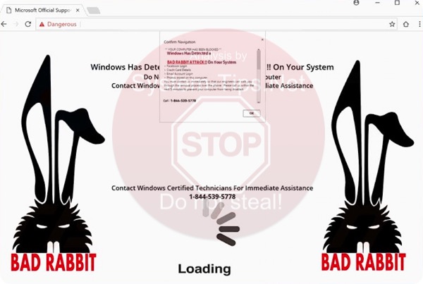 Bad Rabbit Attack 1-844-539-5778 pop-up unexpected alerts may start suddenly attacking your browser and telling you various scary things, such as the infected status of your computer. This is done for the only reason – to make you pay money in favor of cyber frauds who stand behind such faulty alerts. By the way, these messages are produced by presence of adware in your system. What you should realize is that there are most likely a lot of other unwanted side effects related to presence of adware in your system. We strongly advise that you continue reading this tutorial below that explains what you need to do to get your computer properly fixed.