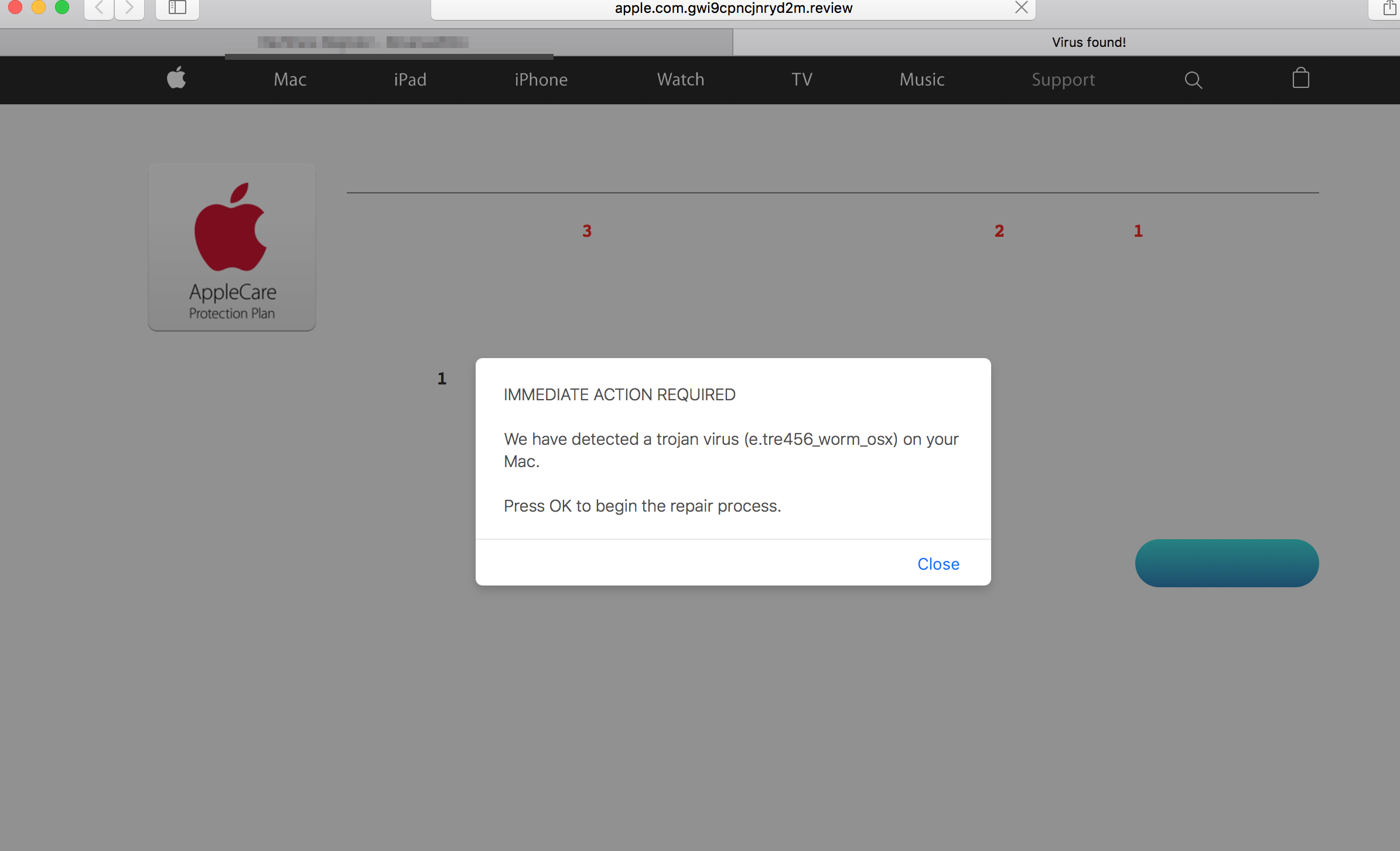 We have detected a trojan virus (e.tre456_worm_osx) on your Mac. Press OK to begin the repair process.