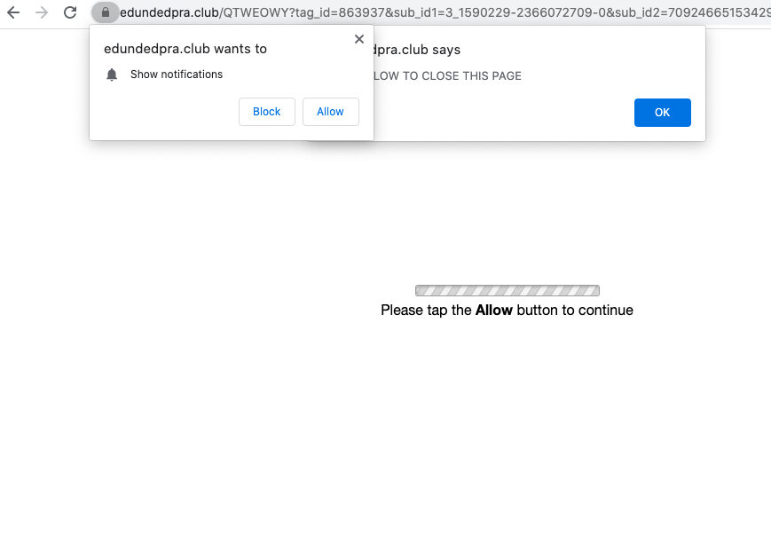 Edundedpra.club pop-ups have the intention to redirect your browser to plenty of other unsafe places in the world wide web. As a result, your home page may be hijacked, whereas the entire system may become infected with other potentially unwanted and even harmful programs. As a result, you may end up facing your computer to be permanently freezing and unable to satisfy your requirements.