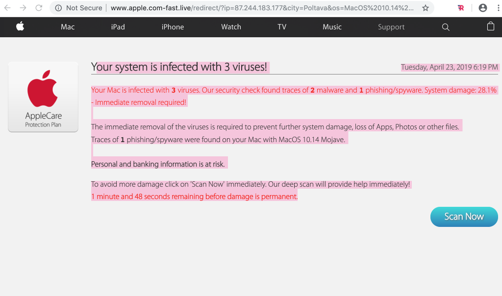 Your Mac is infected with 3 viruses. Our security check found traces of 2 malware and 1 phishing/spyware. System damage: 28.1% – Immediate removal required!