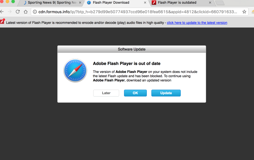You ought to be aware of the truth that this misleading alert from cdn.formous.info is not only fake but malicious. If you use the latest version of Windows of Mac OS Sierra software, you do not need any additional updates to be installed. Yet, if you trust this pop-up, you may end up to see your system absolutely out of order due to so many additional useless programs installed through these faulty alerts. So, be very careful!
