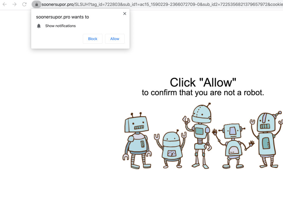 Soonersupor.pro pop-ups have the intention to redirect your browser to plenty of other unsafe places in the world wide web. As a result, your home page may be hijacked, whereas the entire system may become infected with other potentially unwanted and even harmful programs. As a result, you may end up facing your computer to be permanently freezing and unable to satisfy your requirements.