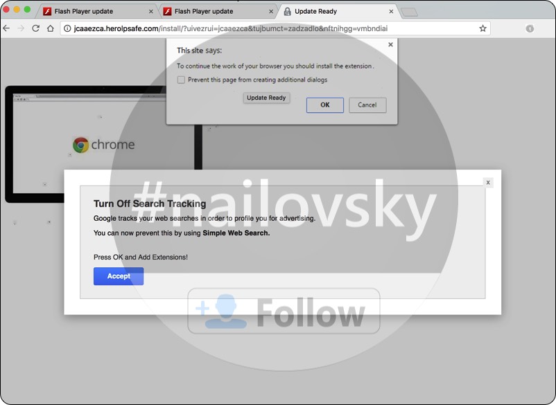 Jcaaezca.herolpsafe.com pop-ups have the intention to hijack Google Chrome browser or to infect it with certain adware that functions through enabling certain suspicious extension. The pop-up will tell that you need to install some suspicious extension into your Google Chrome browser. If you actually agree to proceed with such suggestion you may end up facing your browser to be constantly spewing the multitude of annoying advertisement banners, pop-ups and sudden redirection issues.