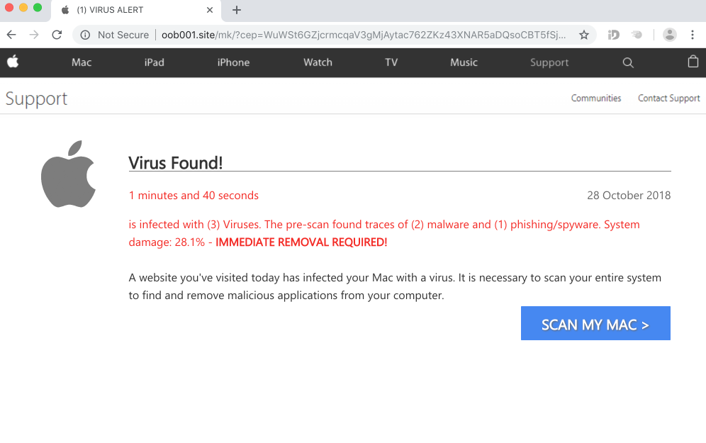 Oob001.site pop-ups have the intention to scare you into downloading certain potentially unwanted applications, such as Advanced Mac Cleaner for Mac, or Win Tonic for Windows. All such programs are not genuine applications. Here is the quotation from such fake alerts produced by oob001.site: