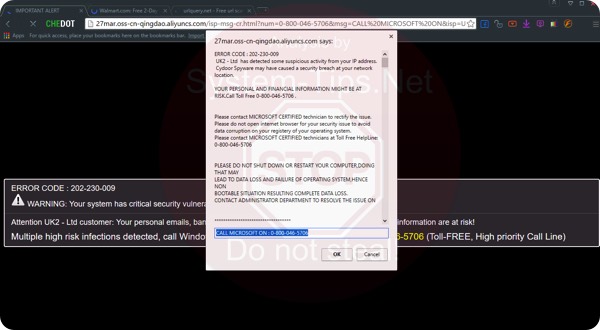 27mar.oss-cn-qingdao.aliyuncs.com pop-up window presents scary alert about your computer to be supposedly infected with malware. The warning may give you some technical information, but the fact is that this information is absolutely fake. Nevertheless, your system is indeed infected, but the message expressed in these scary alerts does not intend to help you fix it. Instead, the mission of this pop-up is to lead you to calling fake tech support toll free line where cyber frauds will force you to pay money in their favor. Here is what this message says once it appears through infected browser: