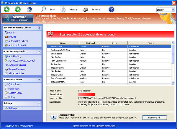 Unlike security services rendered by real Microsoft Security Essentials software, Windows AntiBreach Helper always asks for money from users. However, it cannot render any decent services for computers. The problems it reports are all fake, the threats it supposedly identifies during the fake system scan are all invented.