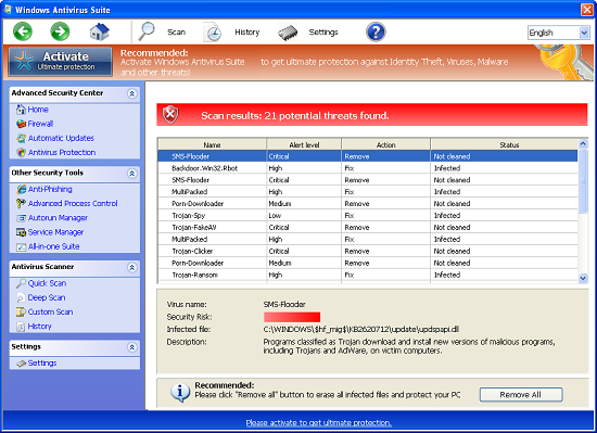 When Windows Anti Virus Suite malware comes into computers it starts its evil job right away. So, this rogue begins scanning your PC, even though in reality this is just the imitation of trying to help you. The fact is that this program is absolutely useless. It cannot render the necessary level of protection for your PC, even if you buy its so-called “ultimate protection”.