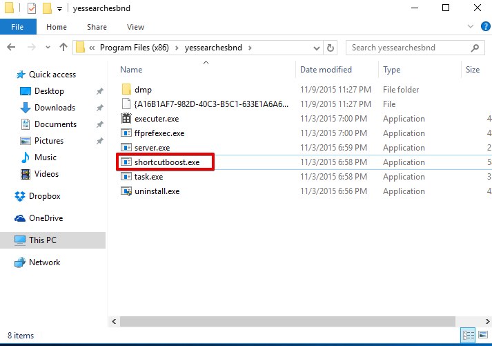 YesSearches is a nasty browser hijacker, which acts in a little bit different way compared to Omniboxes or Tohotweb. Altogether, they were developed in China. But YesSearches uses another mechanism to hijack browsers. It uses shortcutboost.exe program, which runs as a standalone process. It changes the Desktop and quick launch items of all available browsers to be launched through shortcutboost.exe, which is located in a special folder named yessearchesbnd.
