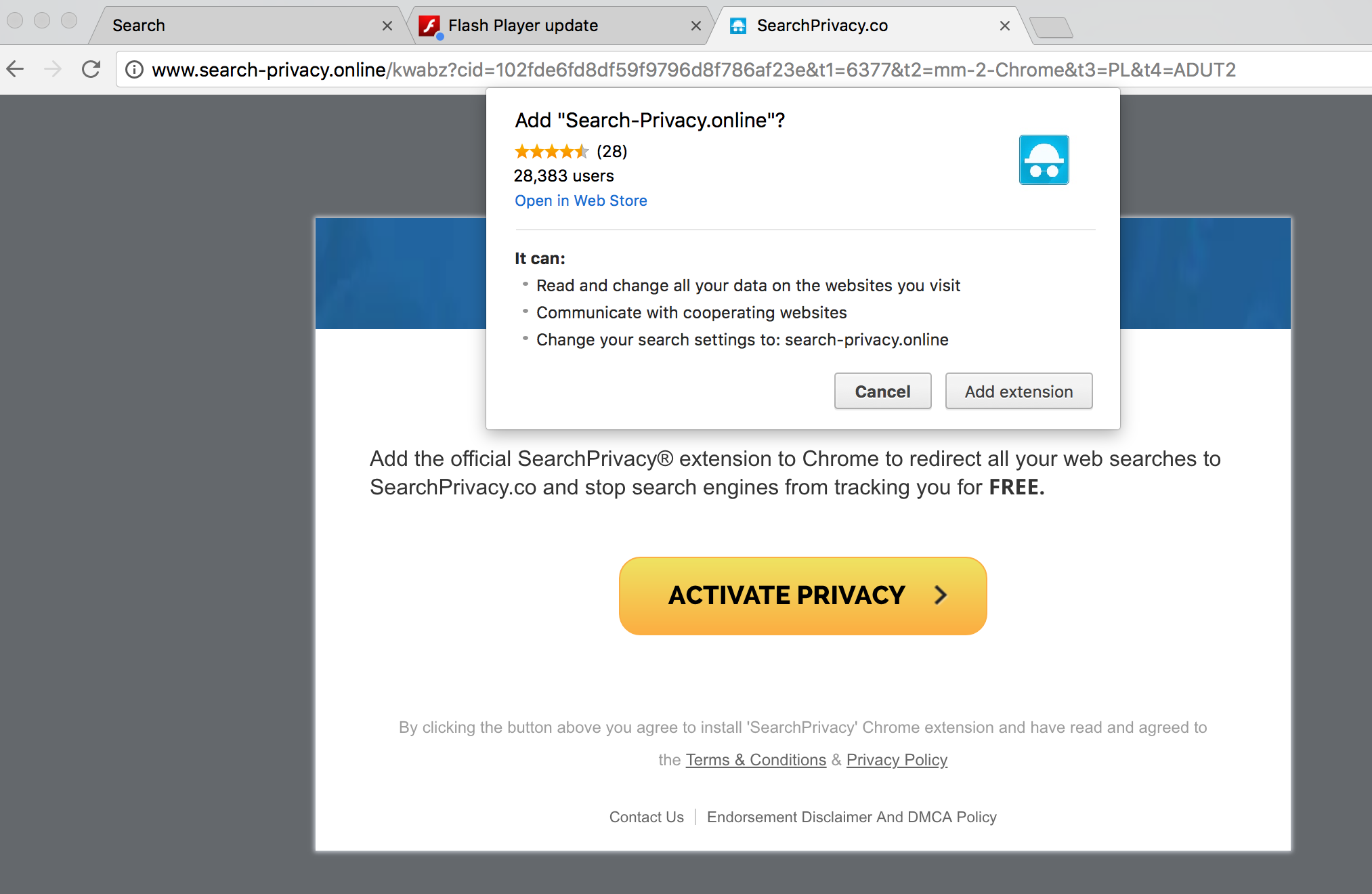 Search-privacy.online pop-ups have the intention to hijack Google Chrome browser or to infect it with certain adware that functions through enabling certain suspicious extension. The pop-up will tell that you need to install some suspicious extension into your Google Chrome browser. If you actually agree to proceed with such suggestion you may end up facing your browser to be constantly spewing the multitude of annoying advertisement banners, pop-ups and sudden redirection issues.