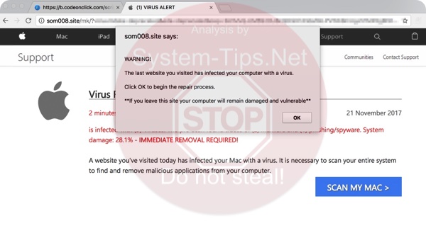 Som008.site is a truly malicious web site related to displaying scary notifications in many computers today. The fact that such pop-ups happen in your browser proves that the entire system is contaminated with malware already. To be more precise, the chances are that your computer has been recently attacked by one of adware programs, which all have in mind to scare you into wasting your funds. If you have revealed that your browser is regularly spewing out such repeated som008.site pop-ups, please immediately follow this removal tutorial to get your system fixed.