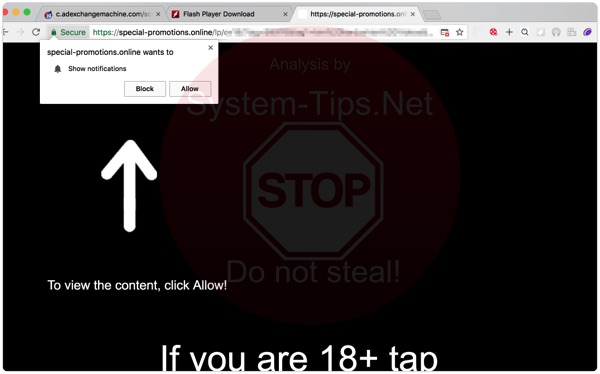 Special-promotions.online is a deceptive site that will appear in your browser on a regular basis in the form of sudden pop-up windows. The sole purpose of these pop-ups is to bring your browser to many unsafe places in the Internet. As a result of such repeated redirections your computer may become infected even more dramatically and you will be permanently experiencing various browser redirection problems, until the main source of special-promotions.online pop-up problem is removed. By the way, there is adware in your system that causes these pop-ups actively. What we advise you to do right now is to thoroughly follow this guide below that explains all steps you should implement to fully fix your computer in an automatic way.