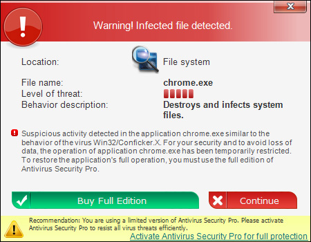 Suspicious activity detected in the application chrome.exe similar to the behavior of the virus Win32/Confilcker.X. For your security and to avoid loss of data, the operation of application chrome.exe has been temporarily restricted. To restore the application’s full operation, you must use the full edition of Antivirus Security Pro.