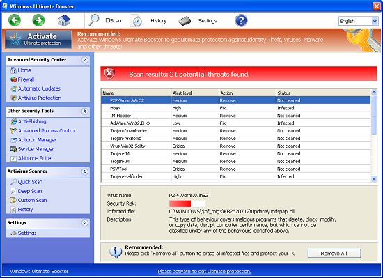 Windows Ultimate Booster uses various vulnerabilities of browsers like Internet Explorer, Google Chrome, Mozilla Firefox, Opera and many others for the interference into your computer. For example, you might get the following scary alert, supposedly coming from Microsoft Antivirus: